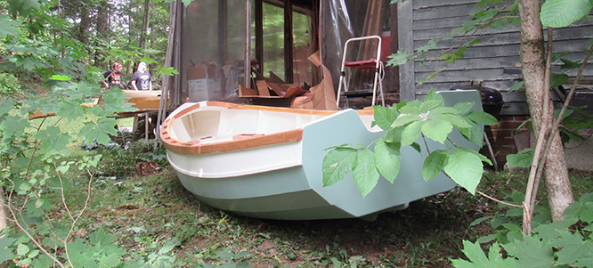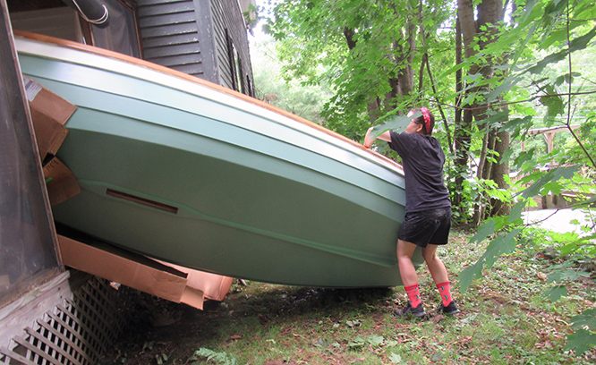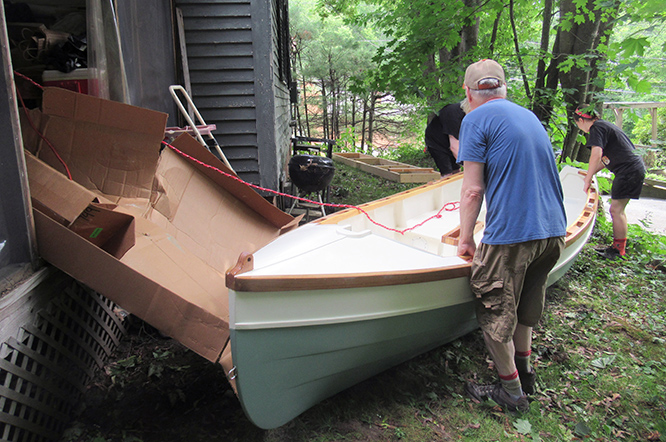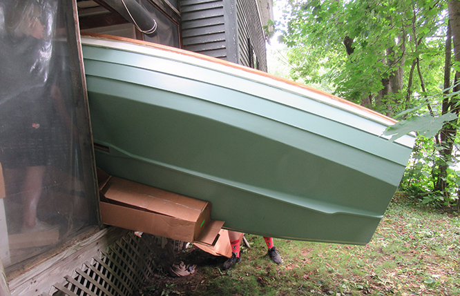 But in the meantime, there is still the task of getting the boat out of the porch/workshop and down to street level.