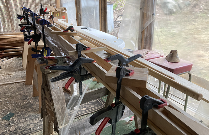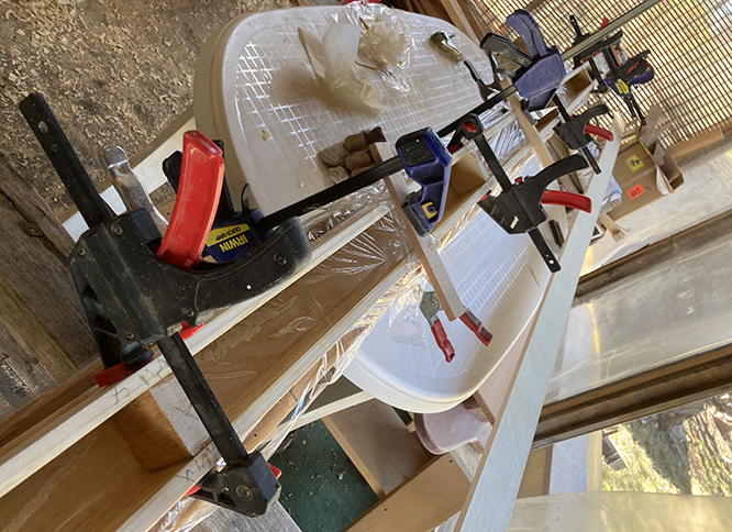 The next day I was able to epoxy the first wide side in place (it's on the bottom in the photo). Maybe I should have done both sides at once, but that would have involved maneuvering large slippery epoxied parts and trying to clamp them all accurately.