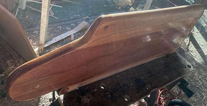 The pivot hole was drilled and pivot bolt inserted to temporarily attach the rudder. The whole assembly still needs a good sanding and varnishing before final assembly.