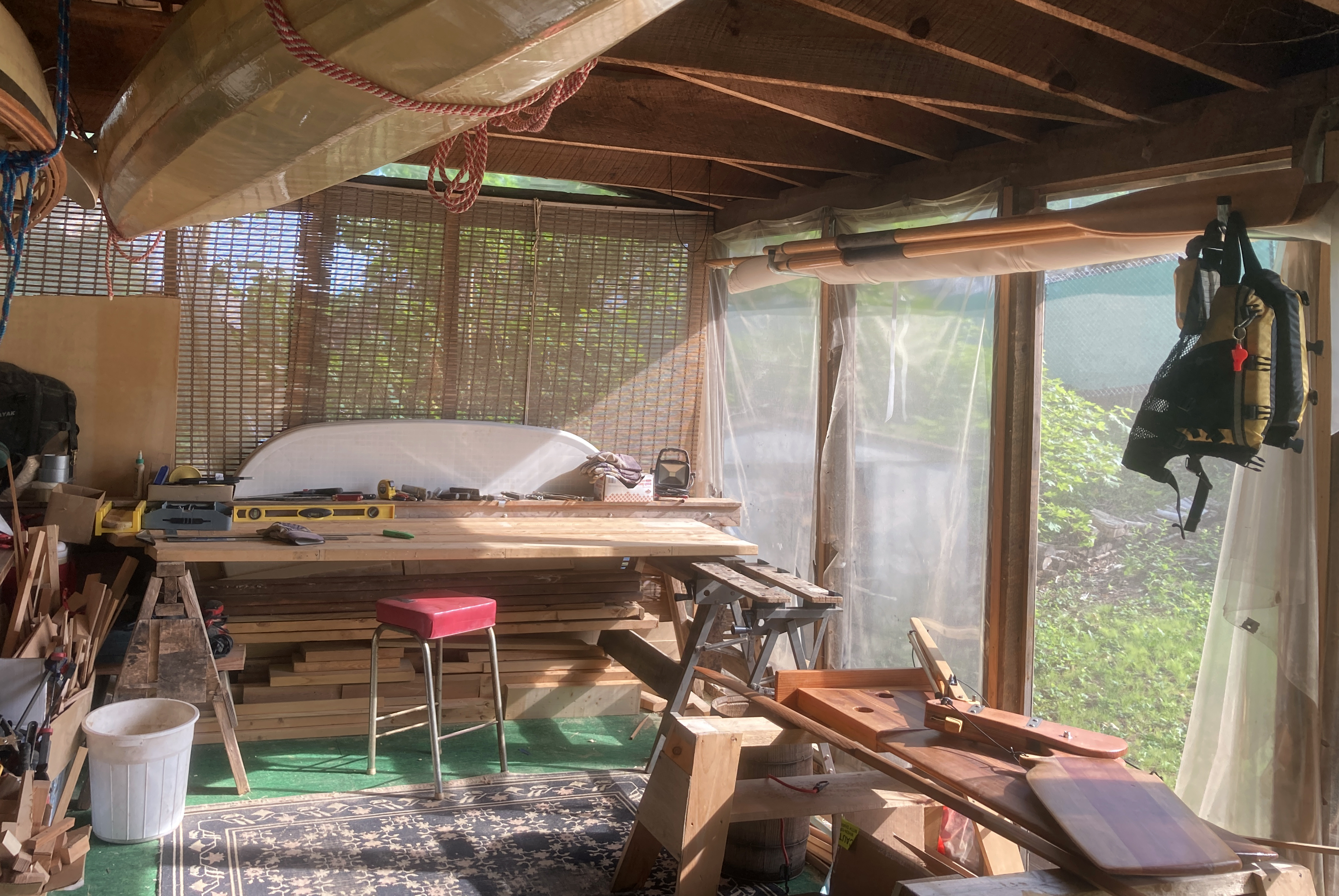 And reorganized and cleaned up the porch a bit. Made a rack to store the sail, spars and oars along the back wall and used some of the extra wood to make a new workbench. There are still a lot of wood leftovers to sort and store.
