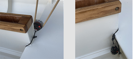 I've also extended the main halyard to be accessible from the cockpit — rather than being tied off on the mast cleat, it now runs through this block on the deck...
