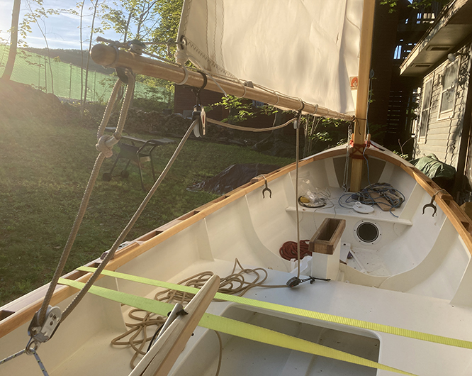 One discovery when all was set up: there is not enough space between the boom and deck for the downhaul. I'll have to run it down to the front seat.