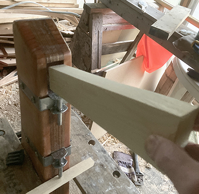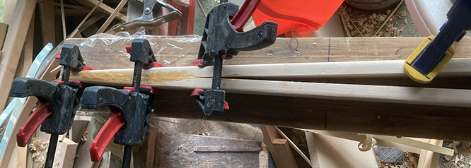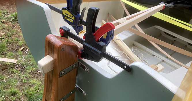 With the remaining pieces clamped in place, I'm trying do determine a good angle, although I may not fix the angle permanently until I have chance to use it out on the water.