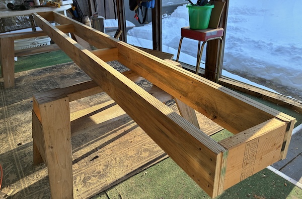 I repeated that process to make the other side beam then joined them with 12" scrap 2 x 6s at each end and some spacer/braces along the center.