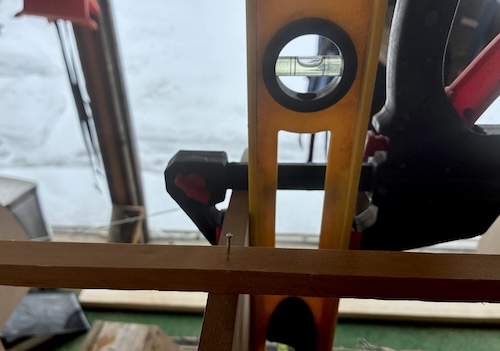 After ensuring the sawhorses and strongback were level, I secured them to each other and to the floor then began permanently attaching the components. All were checked and double-checked for squareness and plumb.