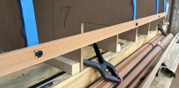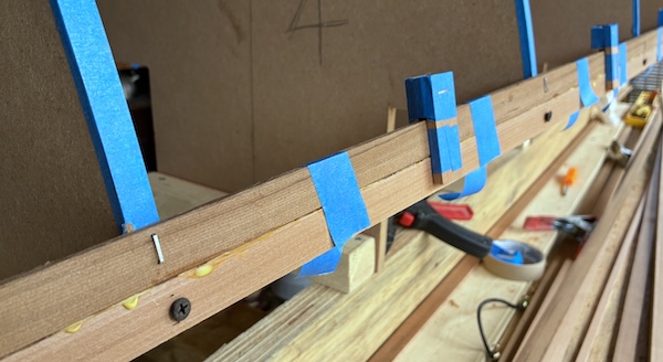 After several weeks of waiting, a single warm day with temps in the 60ºs (F) arrived and I began gluing in the first strips. I'm using staples to hold the strips to the forms and tape along with my clamps to keep the strips aligned and pressed together between forms.