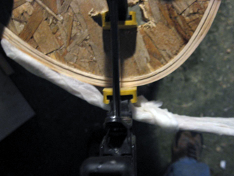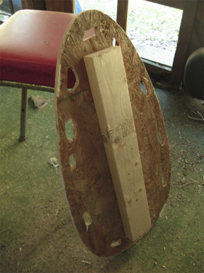 To prepare the form, I cut out some clamping holes and nailed a board to the bottom so it could be held securely in a Workmate.