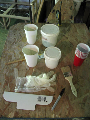 The materials required for the urethane application: plastic spreading card, urethane parts A & B, measuring cups, mixing cups, rubber gloves, stirring stick, disposable paint brush, and a marker I used to darken the measuring lines.