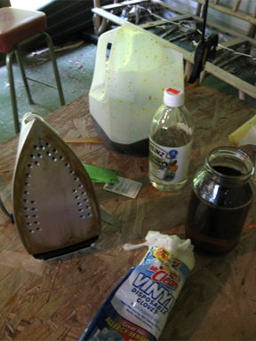 Here are additional dying supplies: rubber gloves, mixing container, vinegar, and an old iron (well, it's an old iron now!).