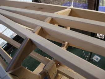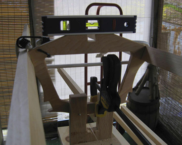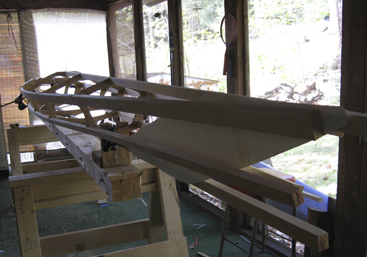 In just a few minutes the remaining cross sections and chine stringers are slid roughly into place and secured with bungees.