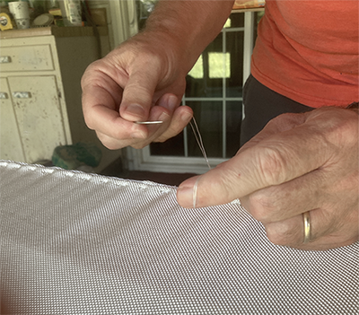 I started stitching with unwaxed dental floss but switched to 30 lb. braided fishing line because the floss was hard to work with and frayed if it snagged on anything.