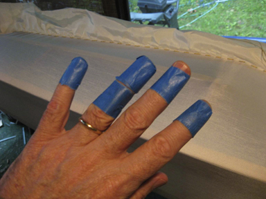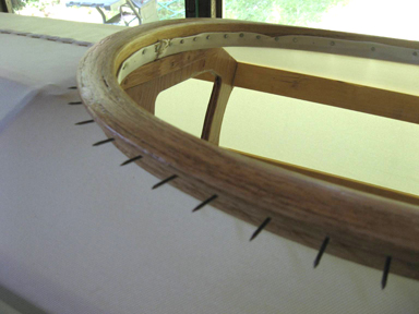 To attach the coaming, I inserting nails into the nylon and out through the sewing holes around the coaming base.